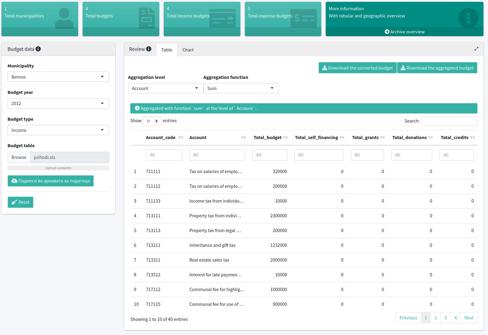 organized an open data hackathon, inviting proposals for applications that would help "open" data generated, collected, and stored by the government in North Macedonia. We proposed an application that would allow uploading, converting, aggregating, analyzing, and archiving budget data for local governments (municipalities). We based our workflow in R and Shiny, leveraging R's blossoming toolkit for data wrangling and analytics, on the one hand and the ever-improving performance and scalability of Shiny, on the other. Visit the app.